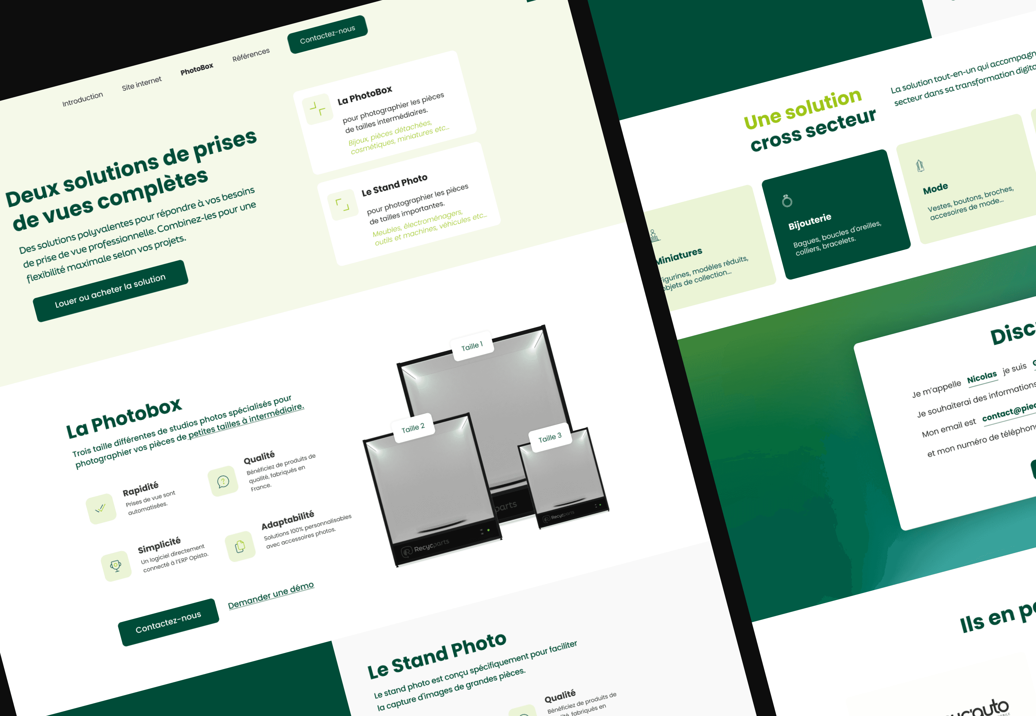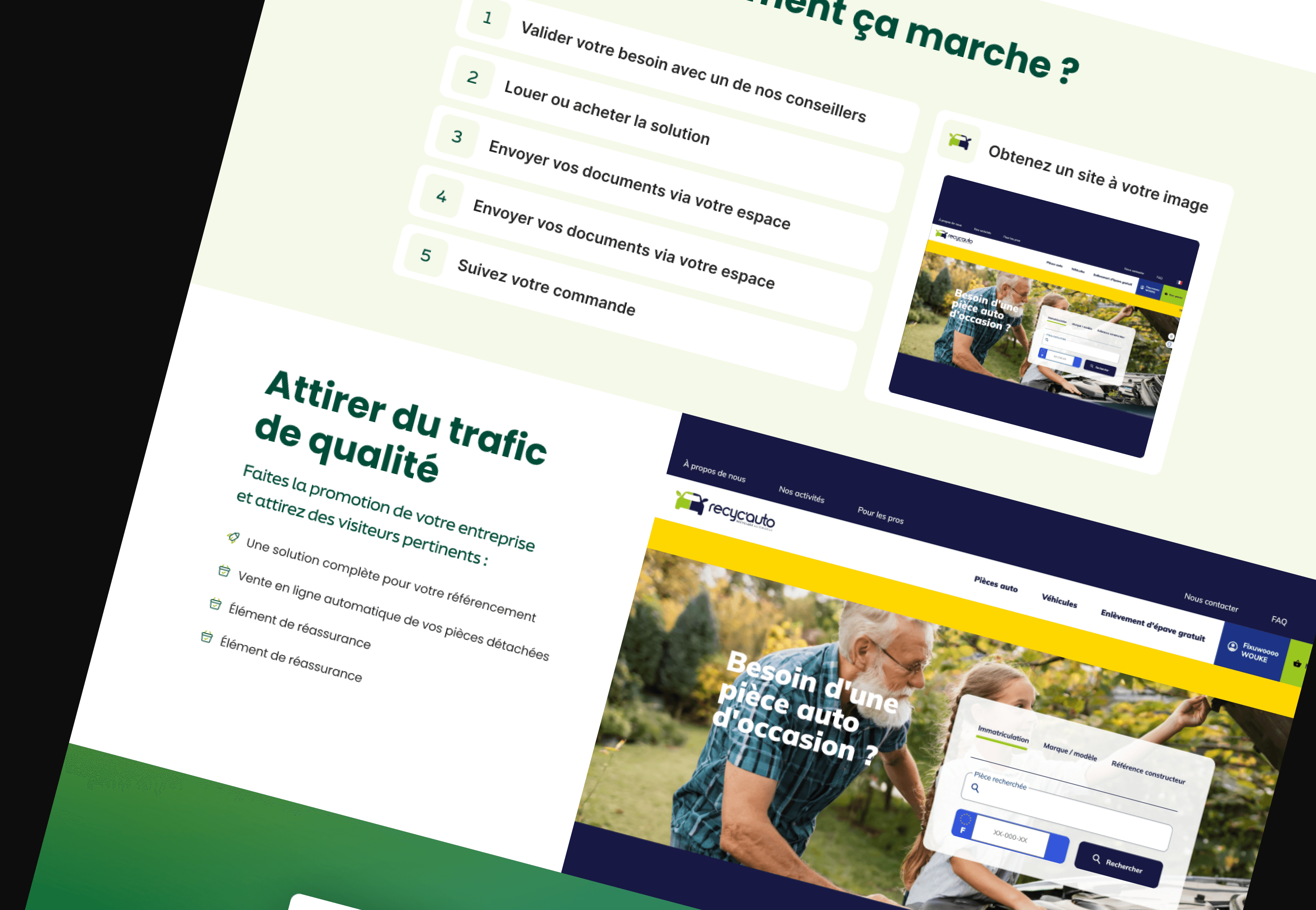 Website for Recycparts, a digital platform that provides digital solutions for automotive recyclers — including professional website creation and an automated photo booth system to capture and upload car parts online. The goal was to create a modern, efficient, and connected platform that highlights the innovation behind Recycparts and simplifies the digital transition for professionals in the recycling industry.
